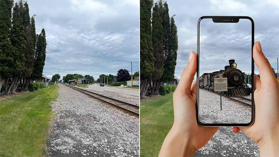 Now, those taking the historic walking tour can simply point their phones to watch iconic buildings in vacant spaces reappear before their eyes, a late-century train arriving at the once-bustling train station and an old mailboat bobbing in the water—with all the intricate details that made them a sight to see years ago. In addition, each of the 29 tour stops features virtual historic markers that tell their tales.